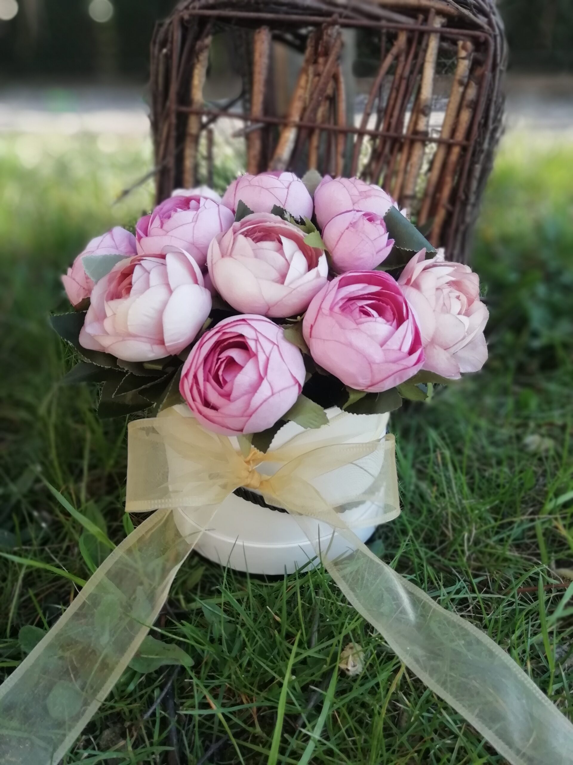 Flower box z różowych kwiatów ze wstążką