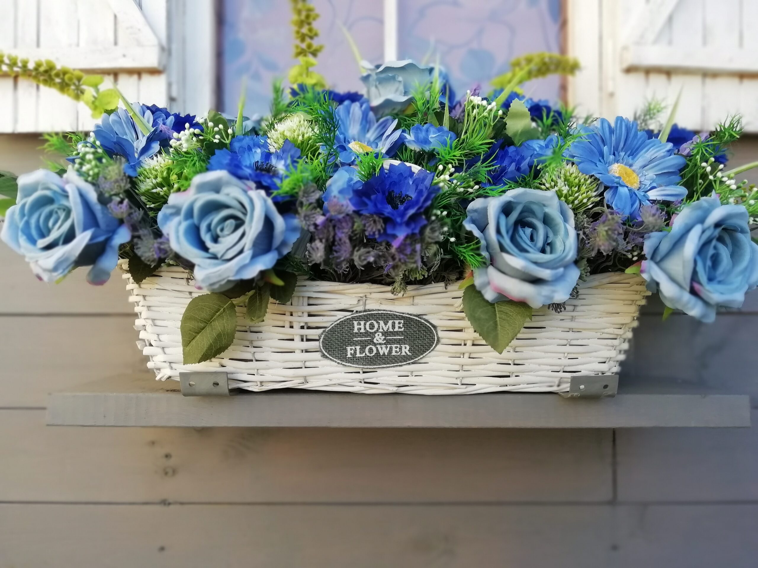 Wyjątkowa kompozycja z błękitnych i niebieskich kwiatów w białym wiklinowym koszyku. Kwiaty w tym kolorze pięknie komponują się z soczystą zielenią i razem tworzą niezwykłą całość. Stworzona po to by wywołać uśmiech na twarzy obdarowywanej osoby.