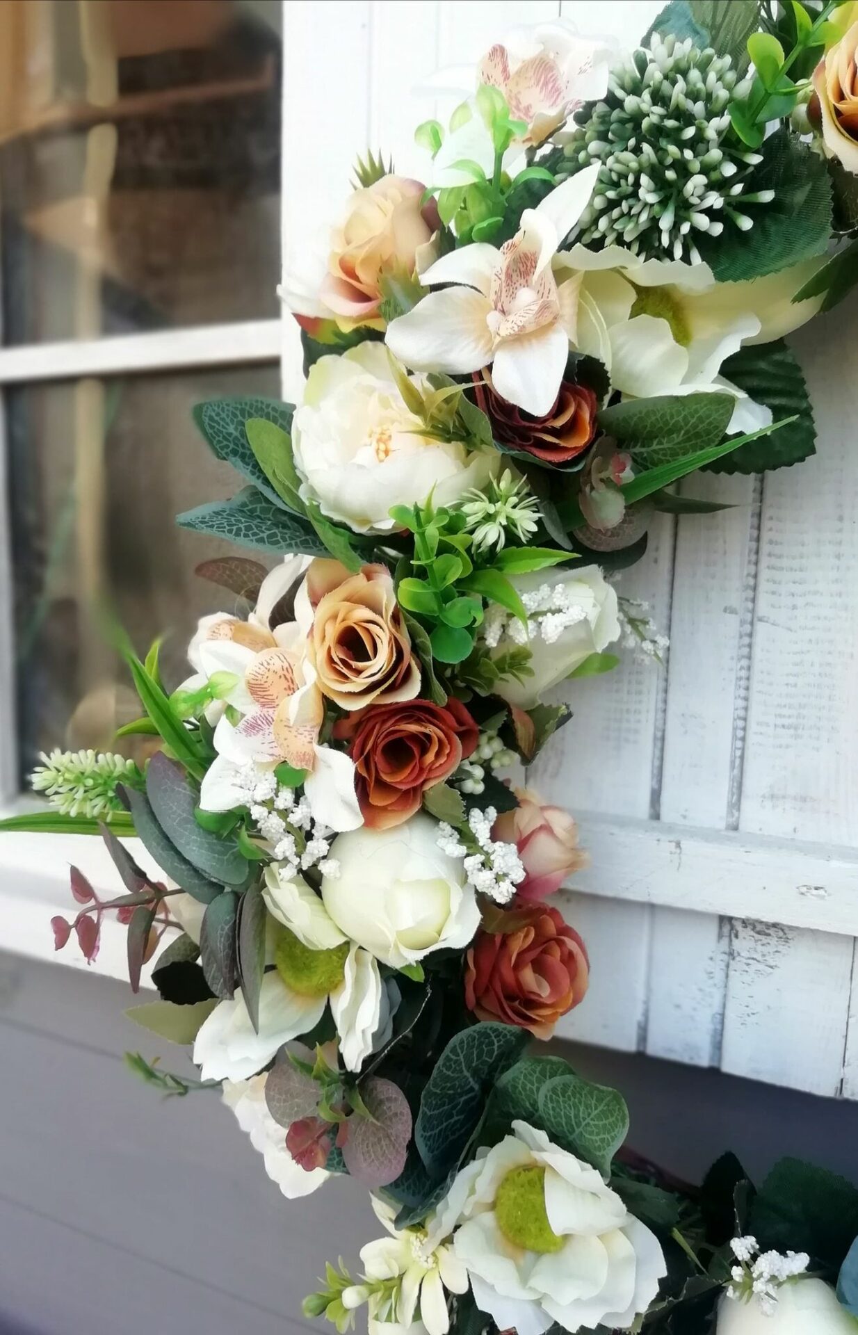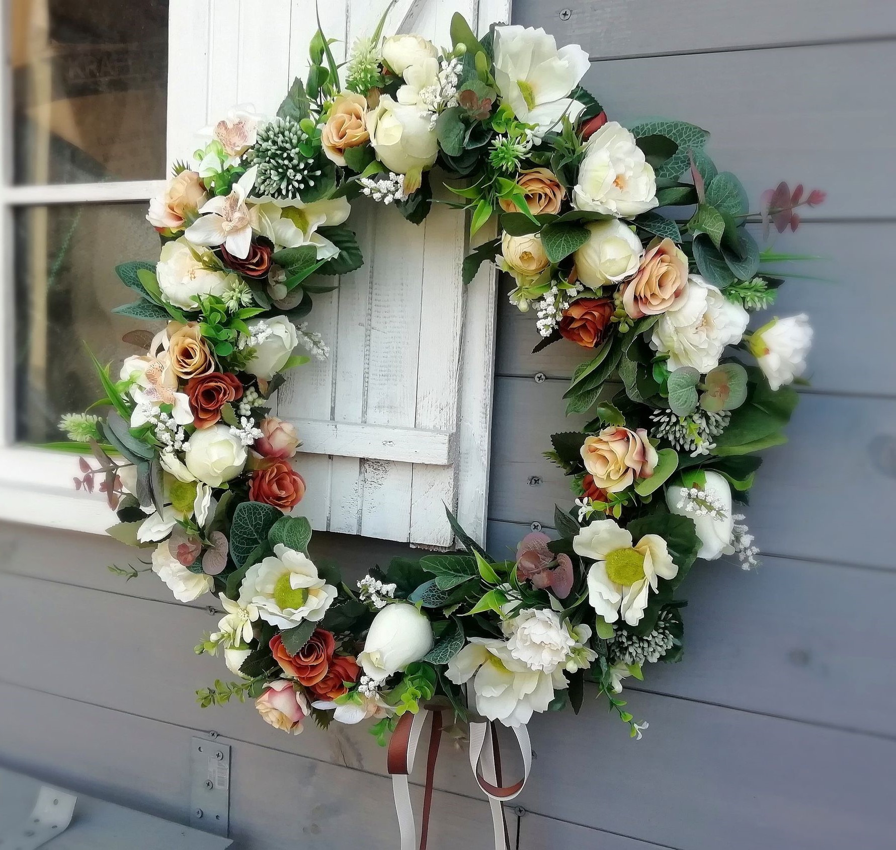 Subtelny wianek z róż w odcieniach bieli, kremu i sepii, którym towarzyszy przepiękna zieleń dekoracyjna. Kompozycję wykonano z wysokogatunkowych kwiatów do złudzenia przypominających naturalne rośliny. Ręczne wykonanie gwarantuje, że nie ma dwóch takich samych egzemplarzy, każdy z wianków jest wyjątkowy i niepowtarzalny. To przepiękna ozdoba, która pasuje zarówno do klasycznych jak i rustykalnych wnętrz. Doskonale udekoruje nie tylko salon czy sypialnię, ale również sprawdzi się jako dekoracja sklepu, recepcji czy poczekalni -żaden z klientów nie przejdzie obok niego obojętnie. To również świetny pomysł na prezent dla miłośników nietuzinkowych ozdób oraz rękodzieła. Będzie wspaniałym podarkiem dla solenizantki, jubilatki czy też dla przyjaciół do których wybieramy się z wizytą.