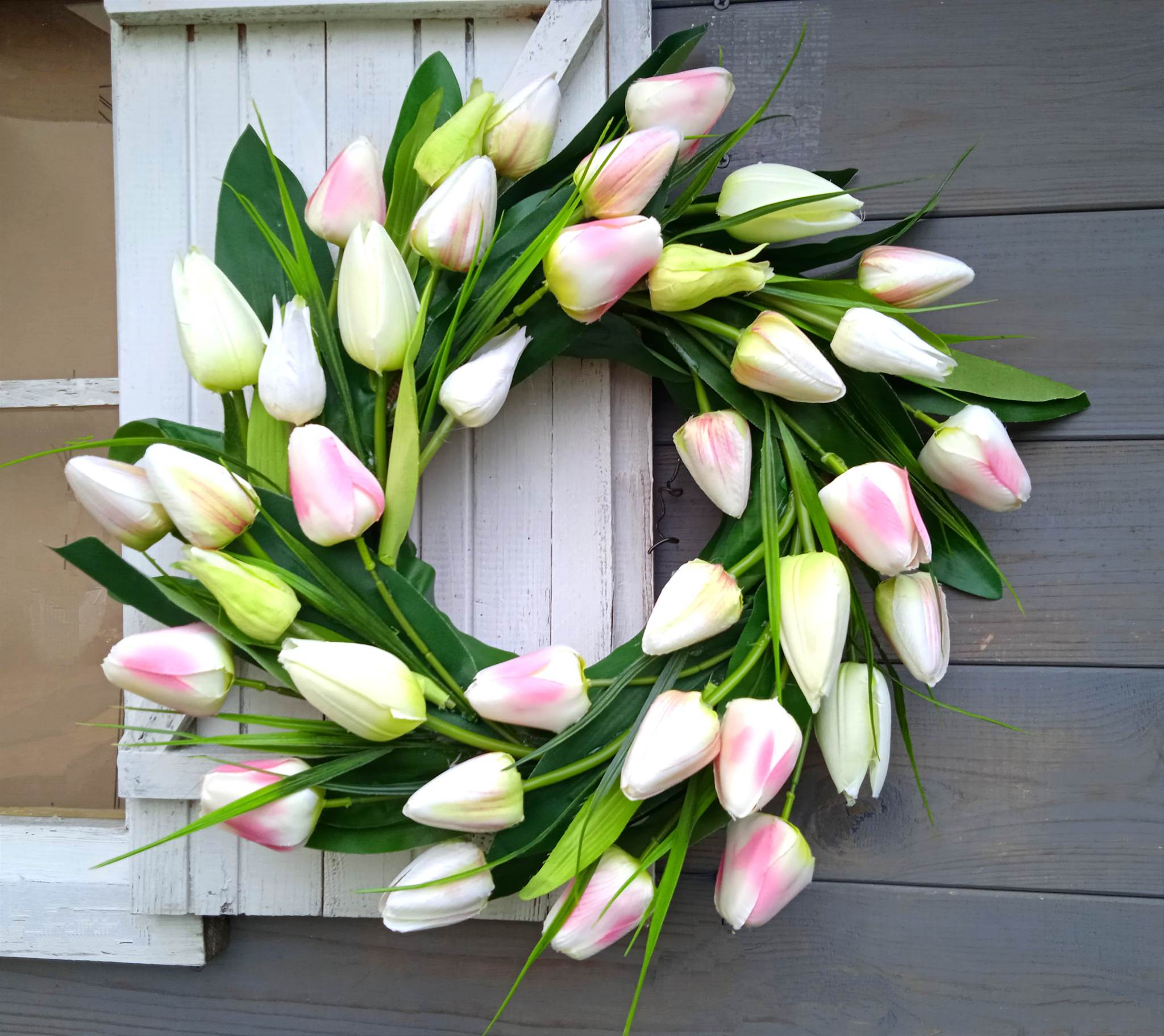 Zachwycający wianek z tulipanów w pastelowych odcieniach kremu, różu i żółci. Subtelny, elegancki, po prostu idealny. Ozdobi nie tylko Wasz dom czy też gabinet, ale może stanowić przepiękną dekorację podczas uroczystości komunijnych, ślubnych czy weselnych. Może stać się doskonałym tłem do robienia pamiątkowych zdjęć z Parą Młodą czy też dzieckiem świętującym przyjęcie Pierwszej Komunii Świętej. Idealnie sprawdzi się jako ozdoba stołu. Wystarczy, że w jego środku ustawimy na przykład figurkę zajączka, a w oka mgnieniu zamieni się w dekorację wielkanocną. A gdy w środku ustawimy świecznik czy też wazon- otrzymamy unikalną ozdobę weselnego stołu. Pomysłów jest tak wiele, a wiec do dzieła- stwórz kompozycję jakiej potrzebujesz!