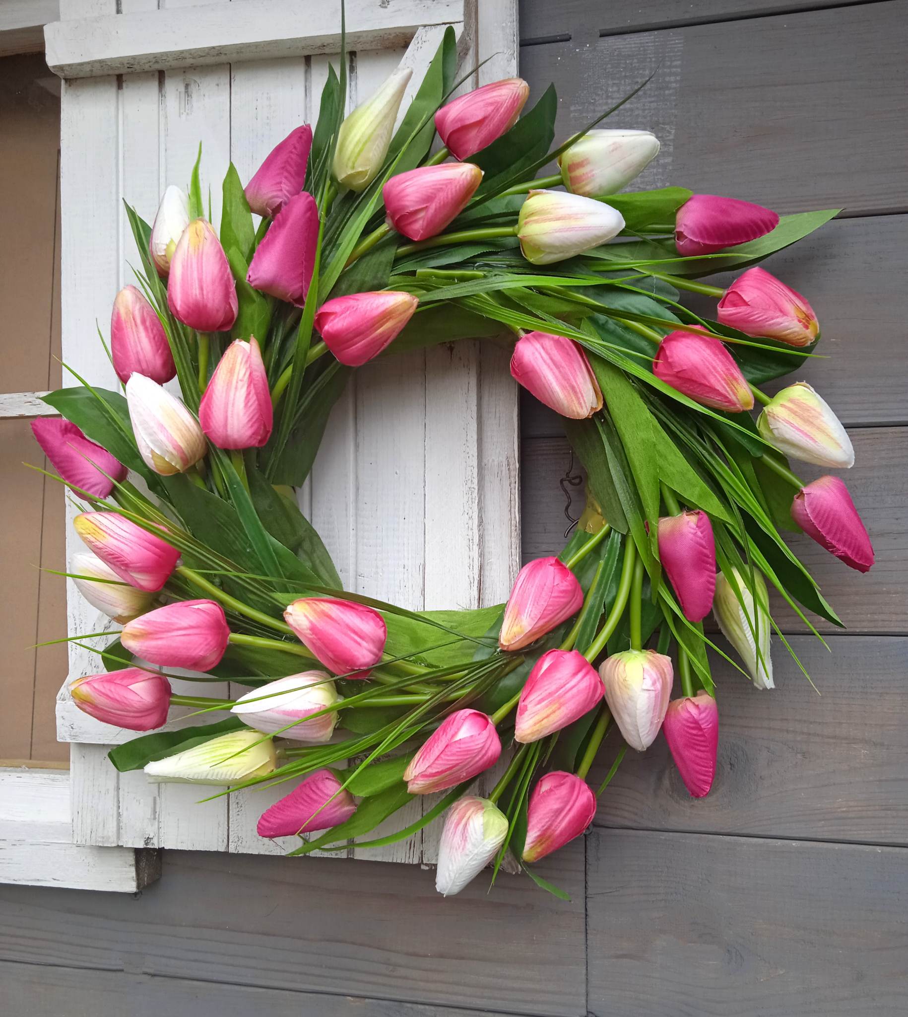Przepiękny tulipanowy wianek w pastelowych odcieniach kremu i różu to nasza najnowsza wiosenna propozycja. Do jego wykonania wykorzystano wysokiej jakości kwiaty sztuczne do złudzenia przypominające prawdziwe rośliny. To ozdoba idealna nie tylko do Waszego domu, ale również biura, gabinetu czy też salonu. Możecie powiesić go na drzwiach wejściowych, na ścianie, w oknie czy też sklepowej witrynie. Bądźcie pewni, że żaden z Waszych Gości i Klientów nie przejdzie obok niego obojętnie.