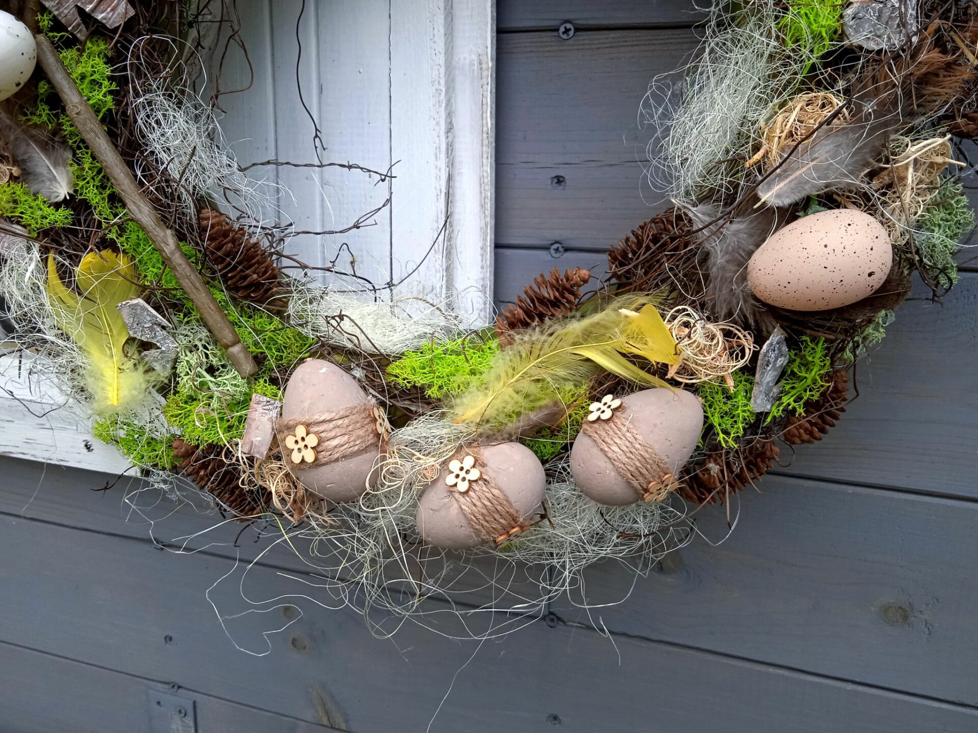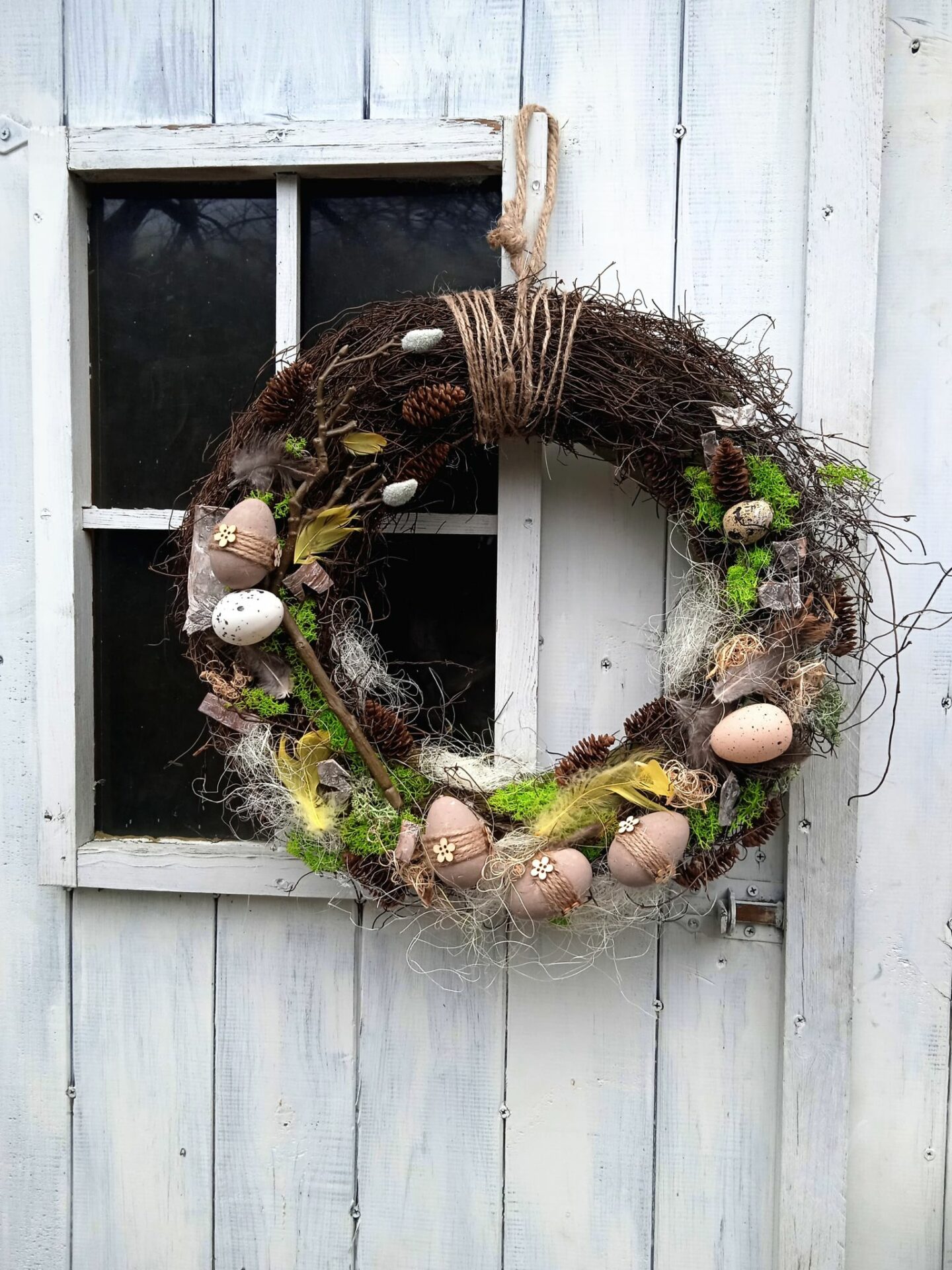Jedyny w swoim rodzaju, ręcznie wykonany wianek Wielkanocny, ozdobiony szyszkami i pisankami. Święta Wielkiej Nocy to okres zmian, porządków i budzącej się przyrody dlatego do stworzenia tej kompozycji wykorzystano przede wszystkim elementy naturalne- gałązki, mech, a także skorupki jajek. Możecie zawiesić go na drzwiach wejściowych, gdzie będzie oczarowywał wszystkich przybywających gości. Nada on również wyjątkowego, świątecznego nastroju wnętrzu Waszego domu. Idealnie będzie się prezentował powieszony na ścianie, w oknie czy też nad kominkiem. Stwórzcie własną dekorację, połóżcie go na stole i ozdóbcie świecami lub świątecznymi figurkami. Możliwości jest tak wiele.