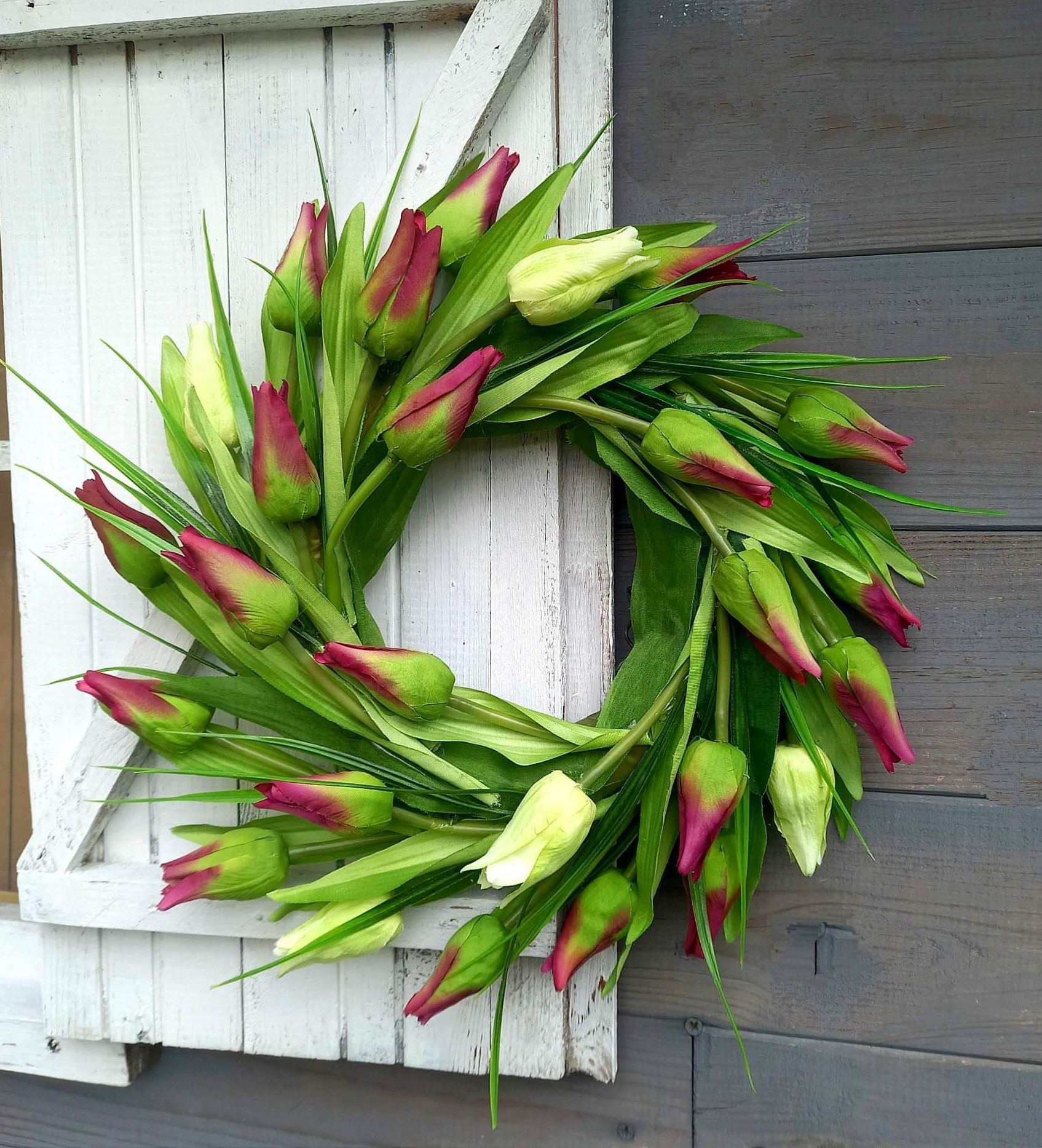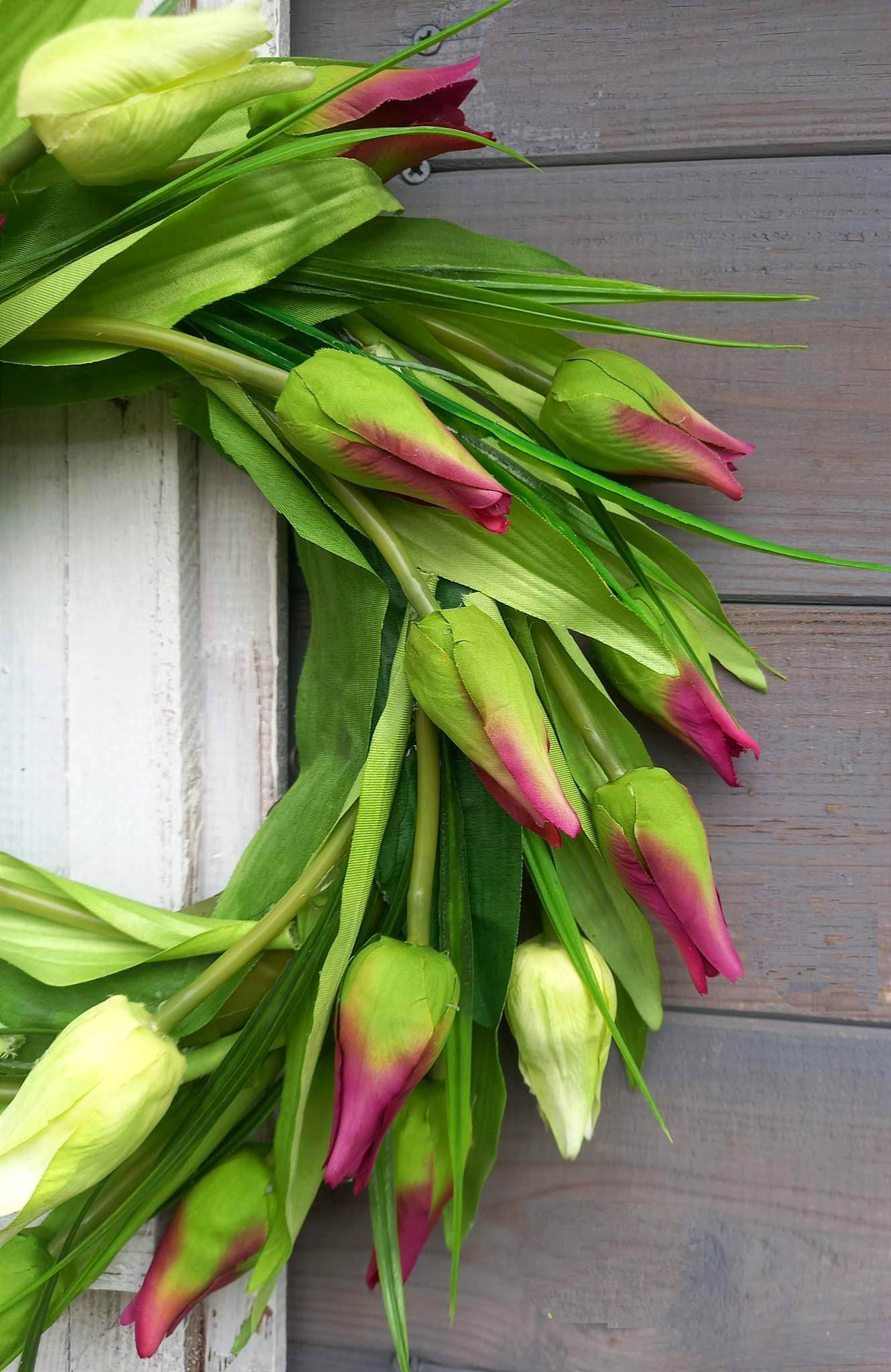 “Dzisiaj rano niespodzianie zapukała do mych drzwi (…) Zapachniało, zajaśniało wiosna ach to ty…” I tak wraz z nadejściem wiosny mamy dla Was kolejną tulipanową kompozycję. Tonące w soczystej zieleni, jeszcze nie w pełni rozwinięte tulipany w kolorze amarantowym i kremowym. Piękno i prostota, to dewiza, która przyświecała nam podczas tworzenia naszego najnowszego wianka. Jesteśmy przekonani, że ta kompozycja trafi w każdy, nawet najbardziej wyrafinowany gust. Wianek ten powieszony na drzwiach, ścianie czy też w oknie będzie stanowić oryginalną ozdobę cieszącą oczy zarówno domowników jak i przybyłych gości.