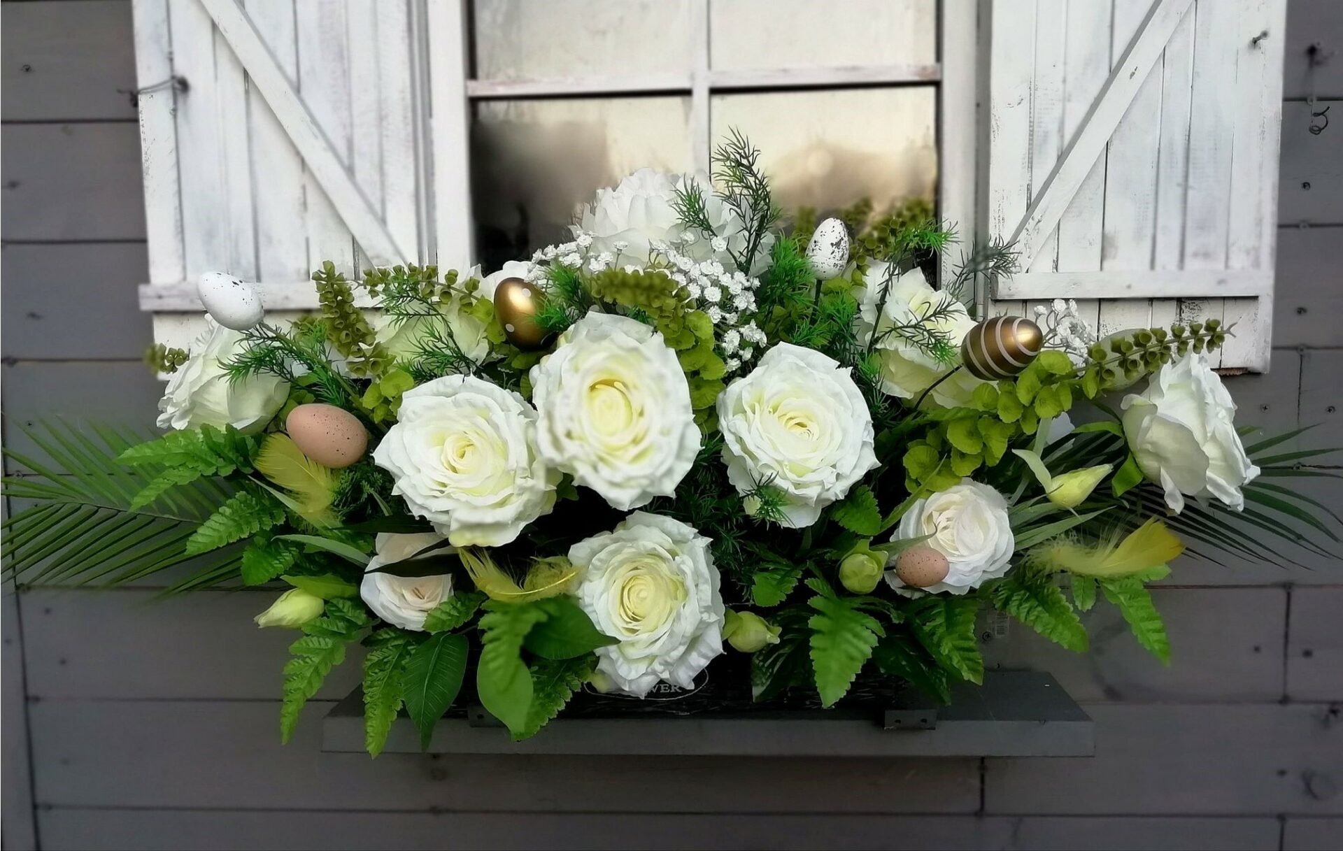 Wyjątkowa i subtelna kompozycja z białych kwiatów otulonych soczystą zielenią. To ozdoba stworzona dla wszystkich tych, którzy szukają wyjątkowej dekoracji do swego domu. Kompozycja ta pasuje zarówno do klasycznych jak i nowoczesnych wnętrz. Wykonana została ręcznie z najwyższą starannością i dbałością o każdy szczegół. Przyozdobiona złotymi pisankami może być wspaniałą dekoracją domu w okresie świąt Wielkiejnocy, po ich wyjęciu nabiera charakteru całorocznej dekoracji. Prezent idealny – która z Pań nie ucieszy się z takiego uroczego podarunku?