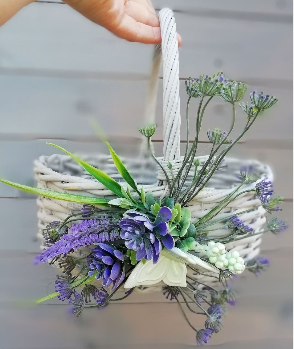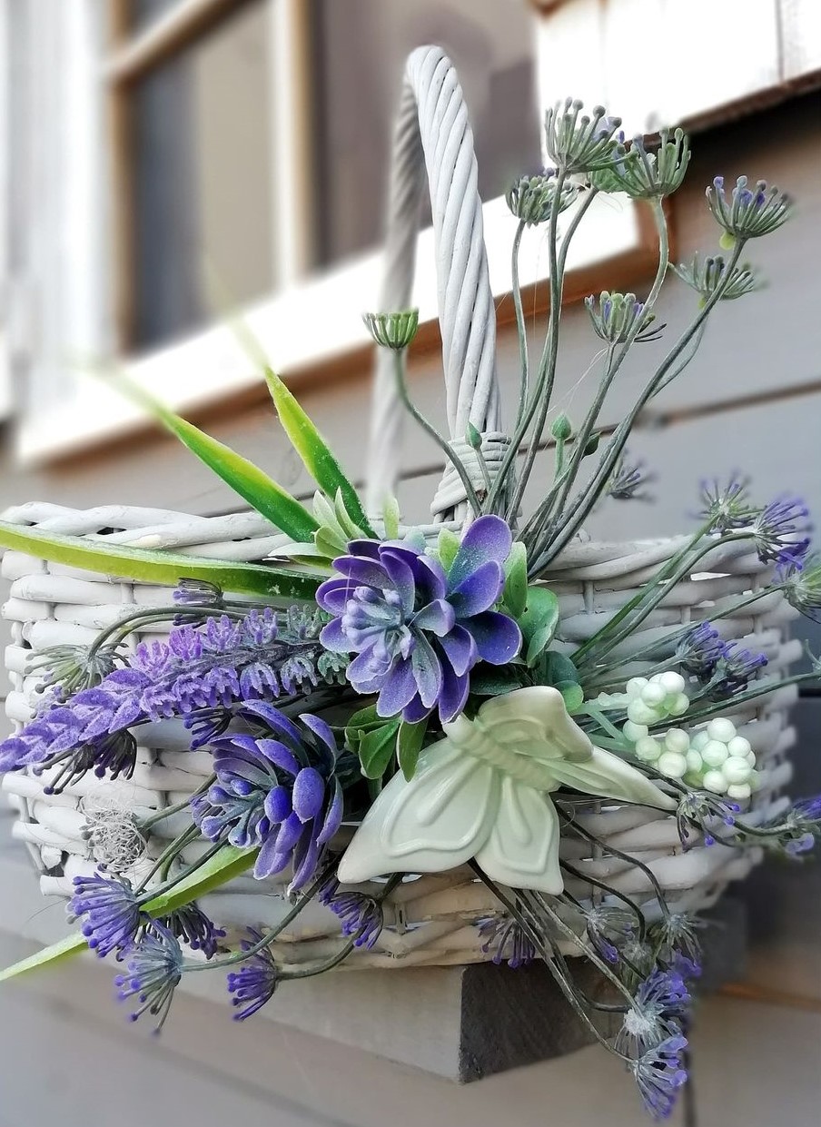 Biały wiklinowy koszyk ozdobiony przepiękną kompozycją kwiatową w której rolę główną odgrywa lawenda. Sztuczne kwiaty użyte do stworzenia tej dekoracji zostały wykonane z niezwykłą dbałością o detale i do złudzenia przypominają naturalne rośliny. Koszyk idealnie sprawdzi się zarówno jako całoroczna ozdoba domu jak i koszyczek wielkanocny. Dekorację wykonano ręcznie z najwyższą starannością, każdy egzemplarz jest jedyny w swoim rodzaju.