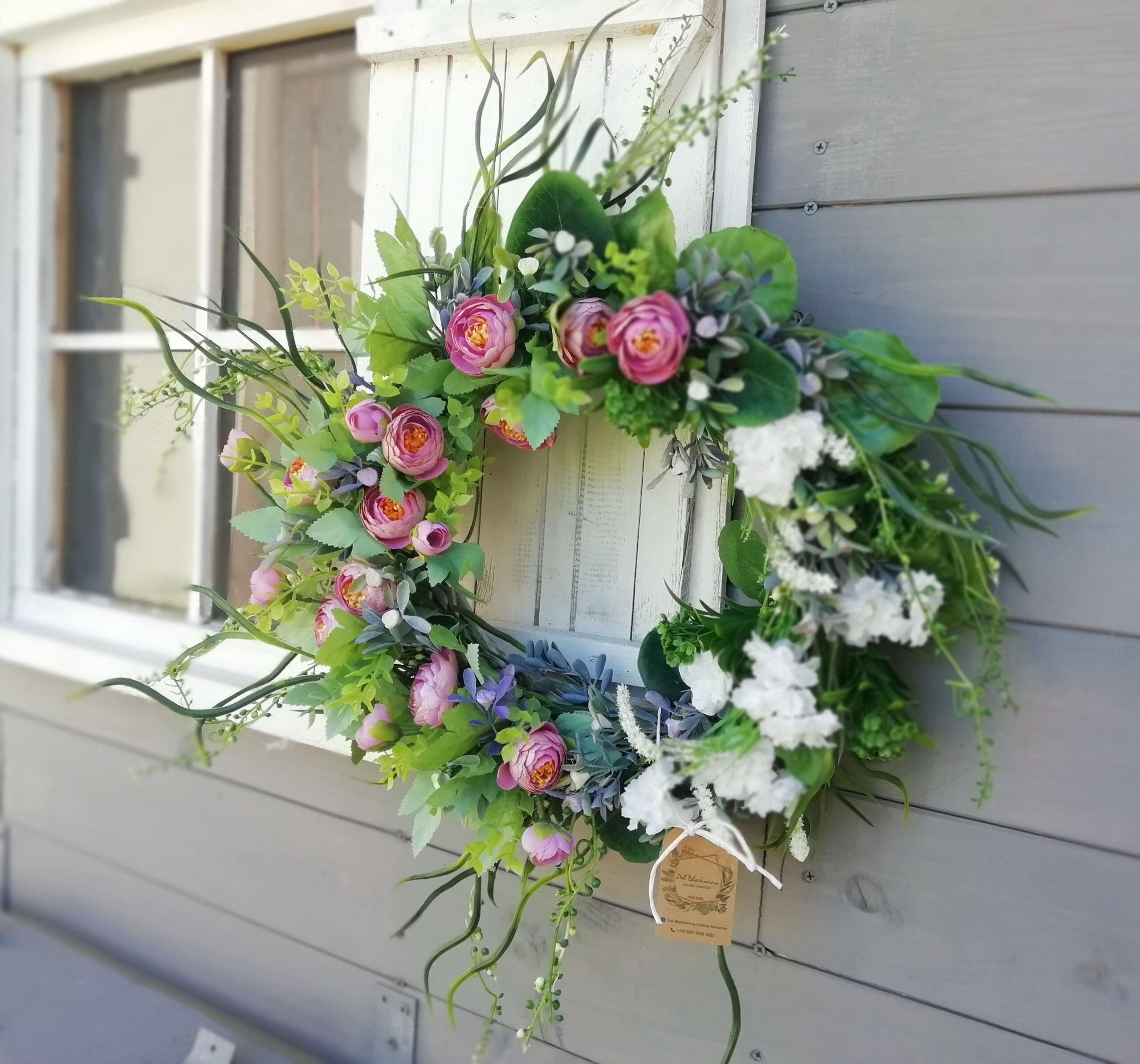 Cudowny wianek dekoracyjny wykonany ręcznie z najwyższą starannością i dbałością o każdy szczegół. Piękne białe i różowe kwiaty idealnie wpasowują się w zieleń. Wianek zawieszony na drzwiach powita Waszych gości, ale równie pięknie będzie się prezentował na ścianie w salonie. Idealny prezent dla osoby lubiącej rzeczy oryginalne i unikatowe.