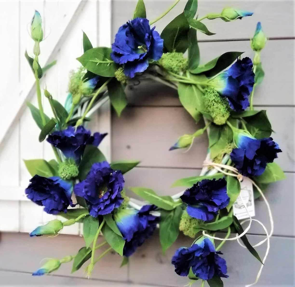 Ten cudowny wianek przyciąga wzrok kompozycją intensywnie niebieskich kwiatów i soczystej zieleni. To ozdoba stworzona dla wszystkich tych, którzy szukają wyjątkowych dekoracji do swego domu. Wianek prezentuje się rewelacyjnie nie tylko na drzwiach wejściowych, ale równie doskonale wygląda zawieszony w oknie, na ścianie czy nad kominkiem. To idealny prezent dla osoby lubiącej rzeczy oryginalne i unikatowe.